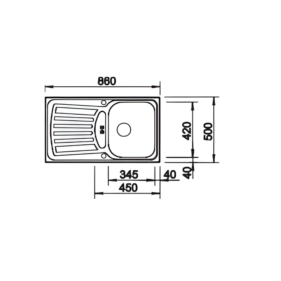 Dimenzije sudopere su približno 860 × 500 mm, a dubina korita je oko 160 mm, što je čini pogodnom za svakodnevnu upotrebu — od pranja posuđa do pripreme hrane. Sudopera se montira u standardnu kuhinjsku ploču ormarića od 45 cm, a reverzibilna ugradnja omogućava da oceđivač postavite sa leve ili desne strane prema potrebi prostora.
