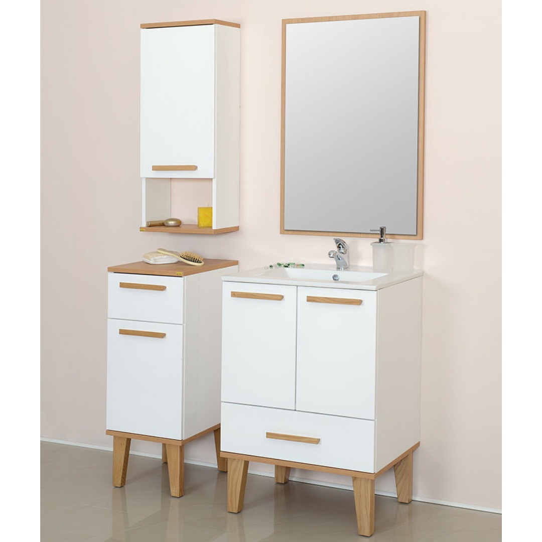 Beli visokosjajni finiš ormarića doprinosi modernom izgledu, dok drveni detalji dodaju toplinu i eleganciju. Ormarić je opremljen sa dve fioke i jednom policom, omogućavajući efikasno odlaganje i organizaciju kupatilskih potrepština. Njegov dizajn omogućava lako uklapanje u različite stilove enterijera, od klasičnih do savremenih.
