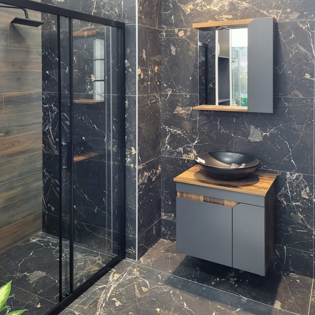 Antracit boja i mat — dekor drveta omogućavaju da se ormarić uklopi u savremene, minimalističke ili industrijske enterijere, a neutralna nijansa dobro sarađuje sa raznovrsnim pločicama, bojama i sanitarnom opremom