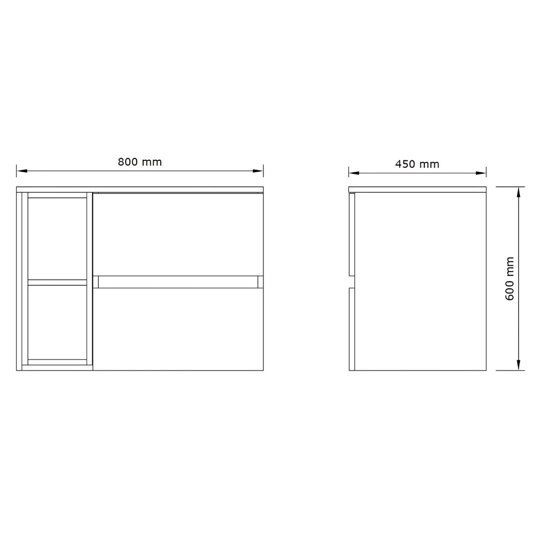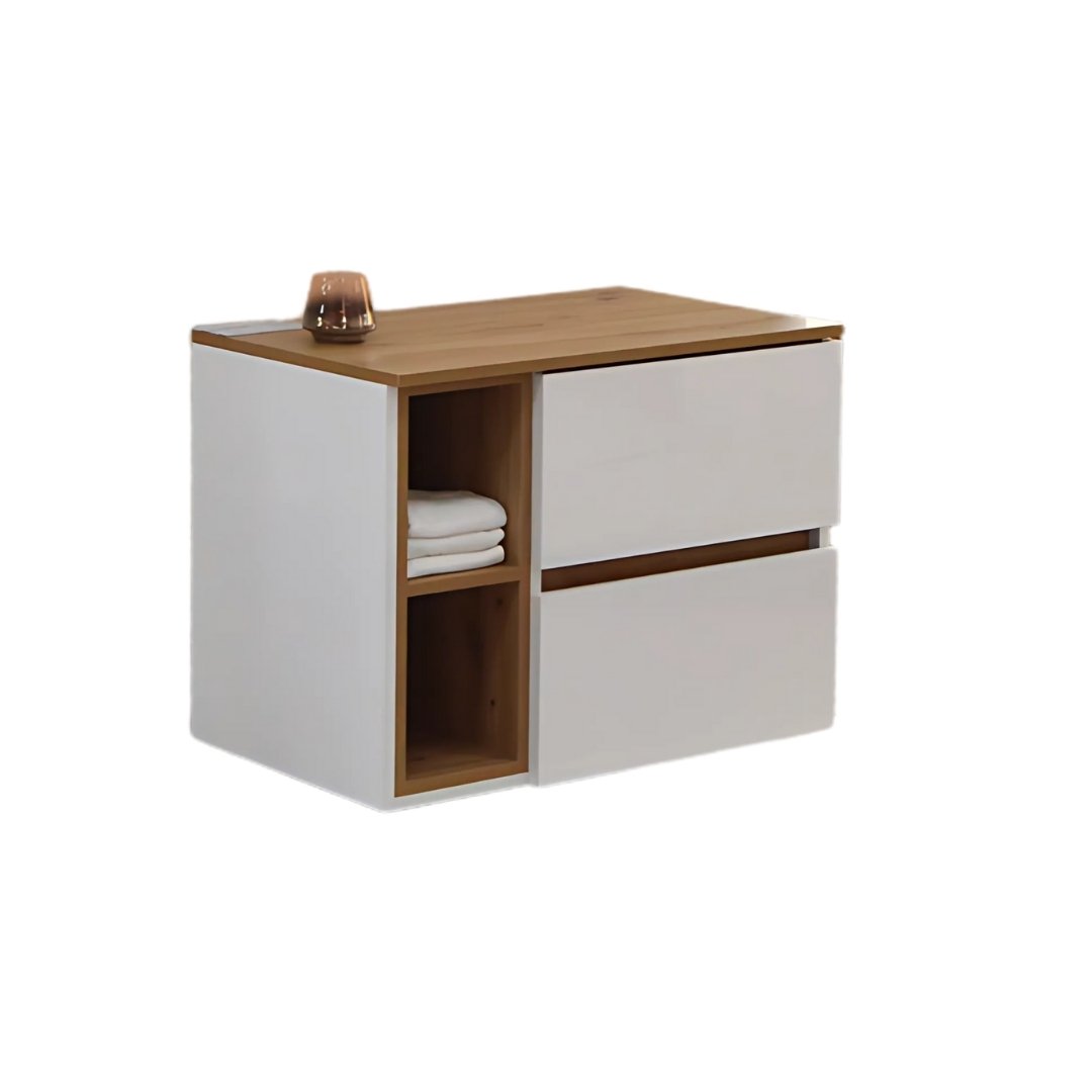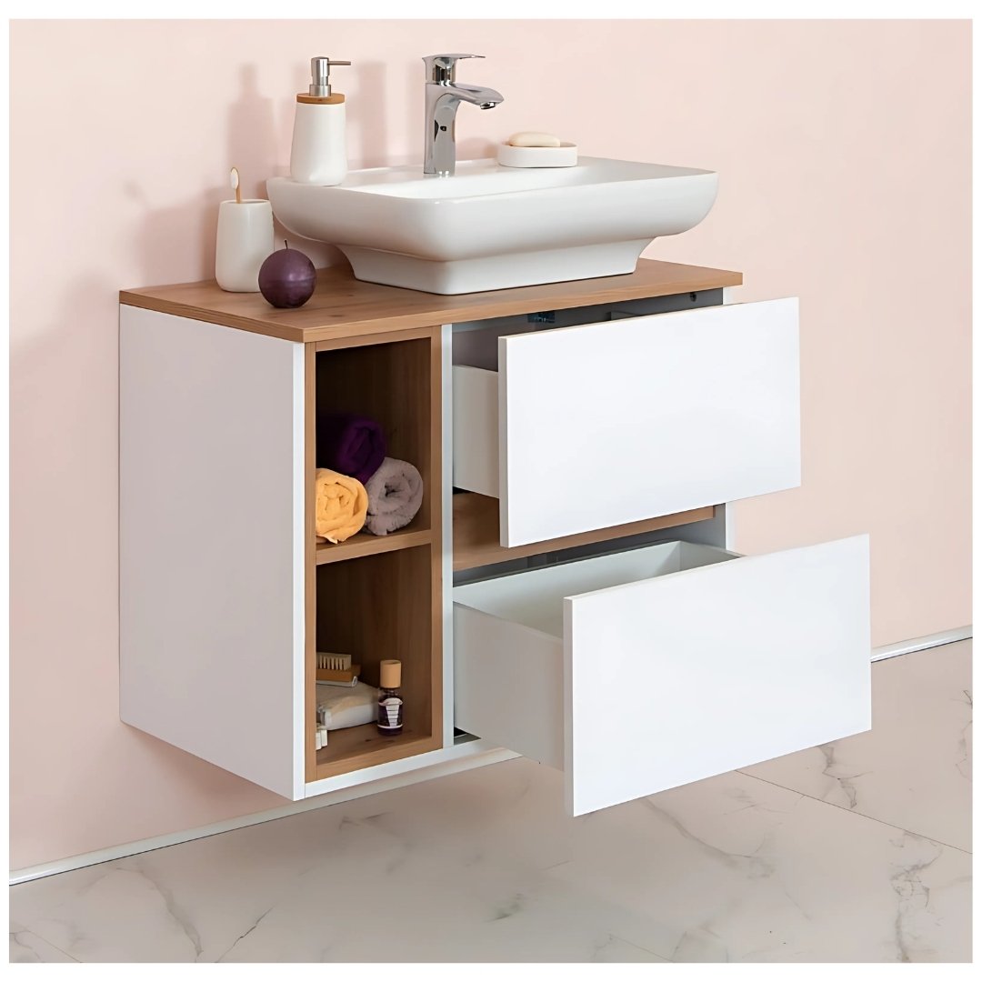 Ormarić poseduje ravnu ploču na koju se postavlja nadgradni umivaonik po vašem izboru, omogućavajući personalizaciju prema vašim potrebama i stilu. Prostor za odlaganje sastoji se od dve prostrane fioke i dve otvorene police, koje mogu biti smeštene sa leve ili desne strane ormarića, pružajući fleksibilnost u organizaciji prostora.