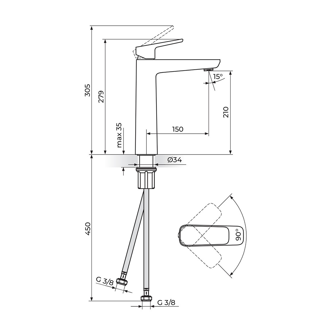 Baterija je izrađena od visokokvalitetnog mesinga i opremljena keramičkim mešačem Ø35 mm, koji obezbeđuje stabilan i dugotrajan rad. Hromirana površina otporna je na kamenac i koroziju, što omogućava jednostavno održavanje i dugotrajno očuvanje estetskog izgleda.
