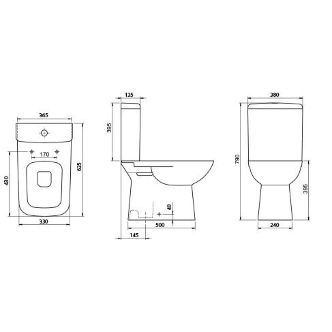 Dimenzije: 62.3–62.5 cm (dužina), 38–33 cm (širina), visina s vodokotlićem oko 79 cm; visina same šolje oko 39.8 cm